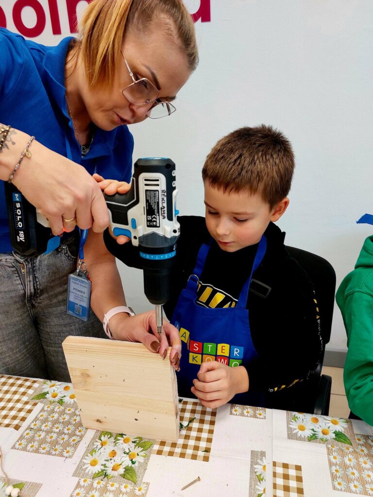 Podczas zajęć uczniowie uczyli się korzystania z wkrętarki do śrub.
